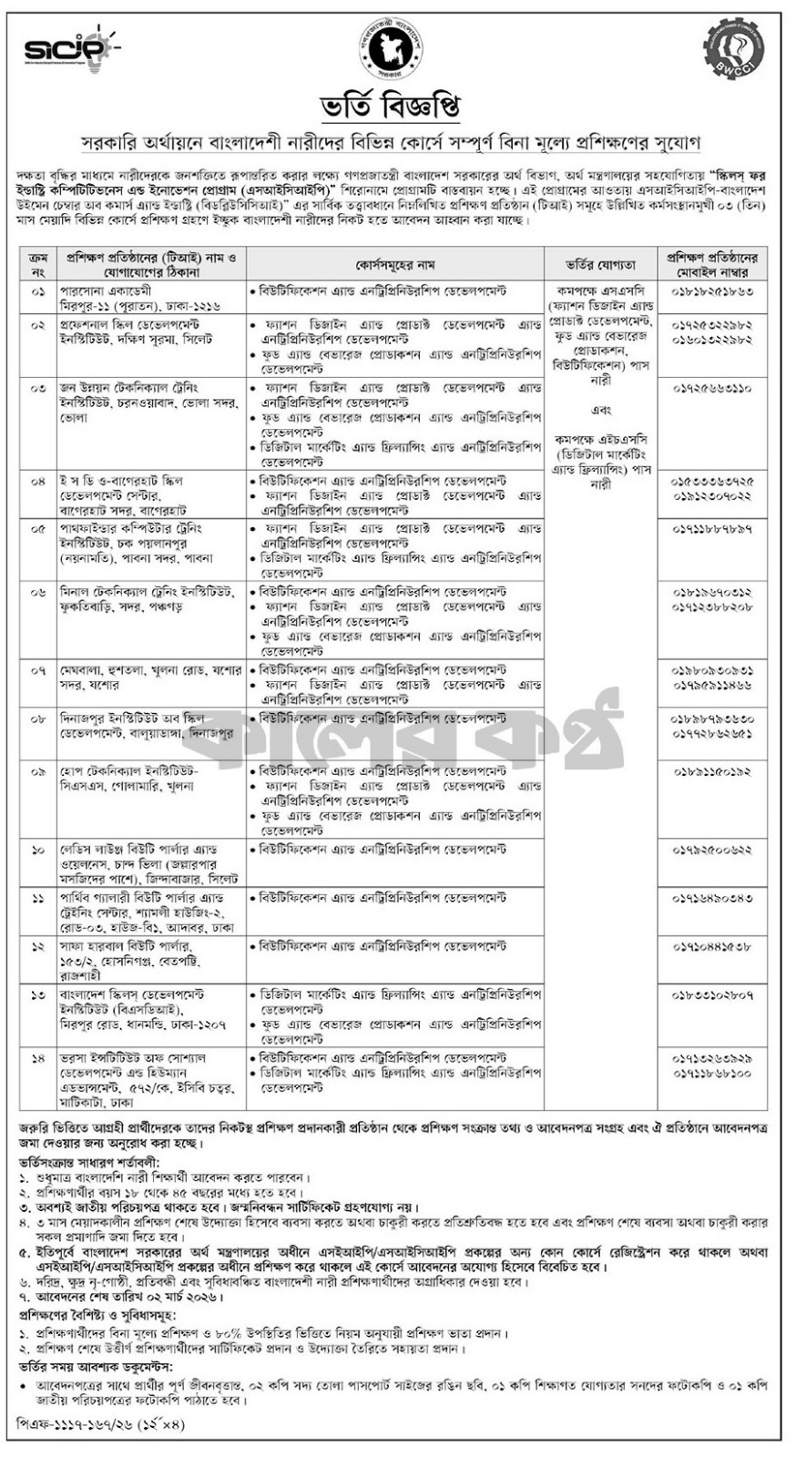 Trainee Admission Notice under SICIP-BWCCI Program